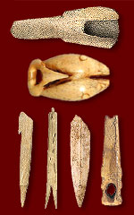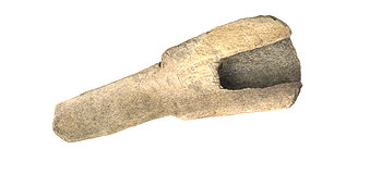 This artifact was made from whalebone. At one end is a sleeve that was meant to hold a blade of some type.